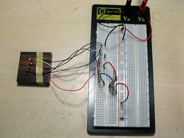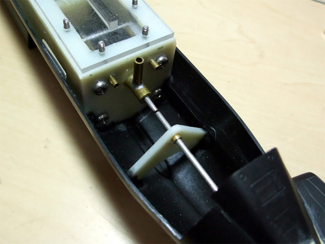 ●1スクリューシャフトを固定するパーツをハルに接着します。パーツ本体はABS板で作り、スクリューシャフトの通る部分は真ちゅうパイプです。艦尾からスタンチューブまでスクリューシャフトを通しておくと、芯出しができてずれが無く固定できます。![]() ギアシャフトとスクリューシャフトはこの位置でゴムチューブを使って接続します。 ![]() ●2縦舵のリンケージロッドは上下の舵を1本のロッドで操作するために、途中で二股に分けてそれぞれのリンケージホーンへ取り付けたリンクへハンダ付けしています。![]() ●3電飾は左右両舷と艦尾灯の3つへチップLEDを使用しています。それぞれのLEDの明るさが同じくらいになるように、電源との間に入れる抵抗を調整しています。この作業はLEDを本体に組み込む前に行っておいたほうが楽なので、ブレッドボードを使用して色々と抵抗値を変えて明るさを調整します。![]() LEDの取り付けを裏側から見たところです。光が内側に漏れないようにと、気泡が溜まりにくいようにプラリペアを使って形を整えています。 ![]() 抵抗を取り付けた基盤は、両面をエポキシ樹脂で固めて甲板の裏側に接着しています。 ![]() ![]() 上へ TopPage [2009/11/29:執筆:雲山]