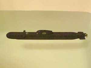 ●1メカ積みが終わったら、浮力の調整を行います。ウェイトも浮力材も入れていない状態では下の写真のように横倒しになってしまいます。![]() 喫水線より下側に少量の浮力材を入れた状態で、艦底部分にウェイトを入れていき、艦の安定が保てるように調整します。そして、ガスタンクを満タンにした状態で、バラストタンクを満水にした状態でセイルの上部が水面に出る程度となるよう、ウェイトの調整をします。 ![]() ●2浮力調整がすめば、無事に完成です。実際に走らせながら、舵の効き具合を見つつサーボホーンの調整を行ったり、エンドポイントの調整を行います。![]()