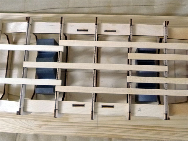 ●キット概要7号には、艦首側のフレームとそのフレームを支える補強材、それに甲板の枕木が入っています。![]() 組み立て前に、パーツナンバーの書き込みと補助線の書き込みをし、ウレタンクリアを塗装しておきます。 ●組み立て艦首キールへ、最先端部のフレーム33から接着します。![]() 6号のフレーム27と今号のフレーム28、29、それに補強材のパーツ34を同時に接着します。この時、フレームとキールとが直角になるようにと、フレームの中央がキールと合うように気をつけます。 ![]() 残りのフレーム31、32、33と補強材のパーツ35を同時に接着します。やはりこの時もフレームが歪んだりしないように気をつけます。 ![]() 最後に、甲板パーツの中央に枕木を接着します。 ![]() 上へ TopPage [2009/10/25:執筆:雲山]