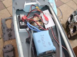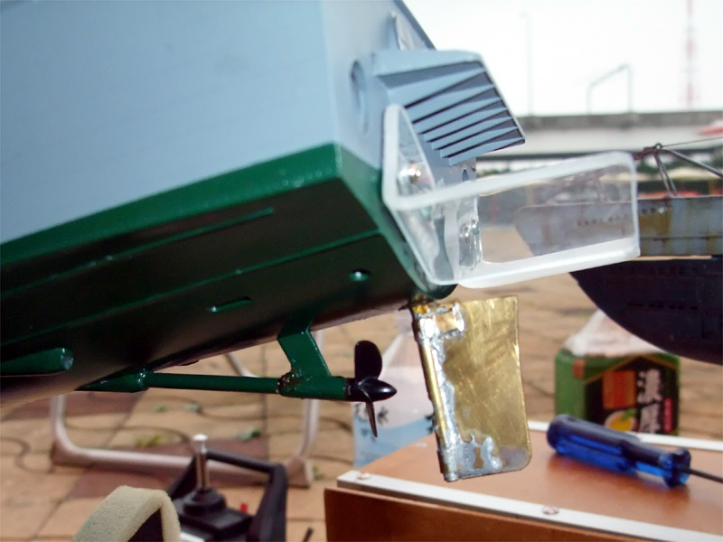 ●外観![]() PT-15は海上自衛隊の魚雷艇として活躍した艇で、タミヤからかつてモーターライズモデルとして販売されていました。モーターによるフリー走航はもとより、ラジコンへ改造して遊べるプラモデルとして楽しまれていたのですが、現在ではディスプレイモデルとして販売されています。 ![]() 今回ご紹介するyoshiさんの作例は、昔出ていたモーターライズタイプのキットを入手し、ラジコン化したものになります。 プラモデルの改造では、細い部品や細かい部品から壊れていきます。特に、手すりなどはよく引っかかったりぶつかったりして壊れやすいのですが、この作品では手すりを全て真ちゅう線で作り直しています。そして、その手すりの根元を這わせるようにアンテナ線を引いており、よく見ないとアンテナがどこにあるのか分からなくなっています。 ![]() 艦底を見ると、透明なアクリル板で作ったフラップが目に付きます。このフラップで高速走航時の頭上げを押さえています。スクリューはキット付属のものを使用。舵は真ちゅう版と真ちゅうパイプで自作されています。よく見るとパイプに穴が開いていて、ここから冷却水を吸い込むようになっています。 ●内部メカ ![]() 内部のレイアウトは上の写真の通りです。甲板とハルの間に5mm角のプラ棒が取り付けてあり、数箇所にナットが埋められています。甲板は小ネジでハルに固定されるようになっています。なお、この角棒と甲板の間にはバスコークが塗ってあり、水が入らないようなパッキンとなっています。 ![]() メカ室前側の様子です。バッテリーパックは単三型ニッケル水素6本をパックにして使用しています。その前方に見えるのがモーターで、自作のウォータージャケットが被せられています。魚雷艇のように高速で走るモデルでは、モーターの発熱に自然冷却では追いつかなくなるため、このような水冷装置はよく使われます。モーターマウントはキット付属のマウントで、モーターとウォータージャケットをタイラップで固定しています。 モーターの左舷側に見えるのがアンプで、右舷側に白い箱の中に受信機が入っています。プラ板で囲うことで、浸水時に水に濡れるのを防ぎます。艦首側奥に青い発泡材が見えますが、浸水が甚大で沈没しかけた時に、沈没を防ぐ浮力材の役目をはたします。 ![]() 艦尾側の様子です。舵のシャフトはパイプになっており、ここから入った水はシリコンチューブを通りウォータージャケットでモーターを冷やした後、艦尾の排水口より出て行きます。舵を動かすサーボは横積みになっており、縦に狭い空間でも邪魔にならないようになっています。 ●総括 ![]() yoshiさんの作例はモーターライズモデルをベースにしてはいますが、モーターマウント以外の走航に関わる部分はほとんど自作されています。ディスプレイモデルを購入しても、そのラジコン化に参考になるのでは無いでしょうか。 Get the Flash Player to see this player.