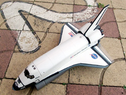 ●外観![]() さて、今回の作例はRNさん作成のスペースシャトルです。なんと言っても元が貨物船ですから貨物室の大きさがたっぷりあり、メカの積み甲斐のあるキットです。しかも、スケールが1/72と大きいものですから、余裕を持って制作が出来るのがいい所です。 キットでは、翼は動翼と一体になっているため、自分で切り離さなくてはならないのですが、翼の上下でラインがずれているため後の工作が少々面倒です。モールドを無視して切り離した方が工作は楽でしょうね。動翼の面積が大きいので、そのままでもそれなりに舵は効きますが、この作例のように透明なプラ板などで動翼の面積を大きくしておくと運動性が格段に良くなります。キットではラダーが動くようになっていますが、実際にラダーを可動にしても、船体がロールするだけでヨー方向の力はかなり弱いため固定にしてしまったそうです。 ![]() オービターのロケットモーター噴射口にはLEDが仕込んであり、青く点滅するようになっています。そして3つの噴射口の中央に、ポンプジェットの噴射口が目立たぬよう置かれています。 ●内部メカ ![]() 貨物室のハッチは観音開きではなく、上へ外せるようになっています。中はごらんのようにWTCが入っており、この中にラジコンのメカやバッテリーが格納されています。